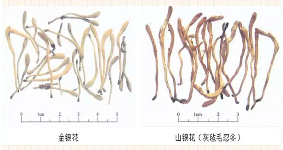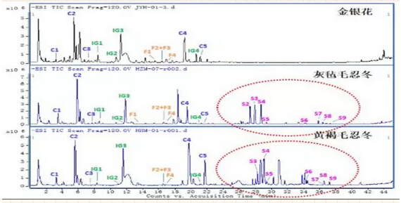 此时又有人问小编了,既然如此相近为什么现在又要将其区分呢?问得真好,容宝宝挠挠头好好想想。两者相同之处虽有很多,但除了产地的区别(金银花多产于北方,山银花多产于南方);最明显的区别也在于药材所含天然化合物成分的差异,山银花中的灰毡毛忍冬皂苷乙Macranthoidin B(S2)、灰毡毛忍冬皂苷甲Macranthoidin A(S3)和川续断皂苷乙Dipsacoside B(S4)就是金银花中所没有的。
