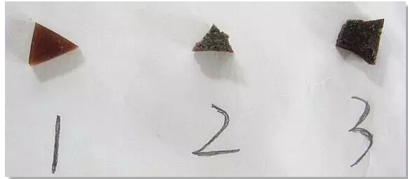 按传统蟾酥鉴别法,若遇水起泡沫则是蟾酥正品,则可初步推断样品2是伪品,样品1、3疑似正品,为了进一步证明推断是否正确,来试试显色法。