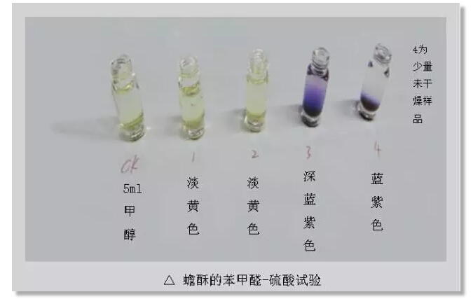 很容易就能发现样品3、4发生了显色变化,这是因为检测出了吲哚类生物碱,说明样品3、4可能是正品,这也排除了样品1是正品的可能性。