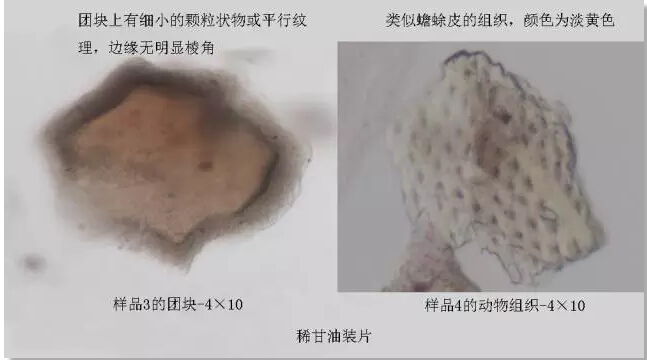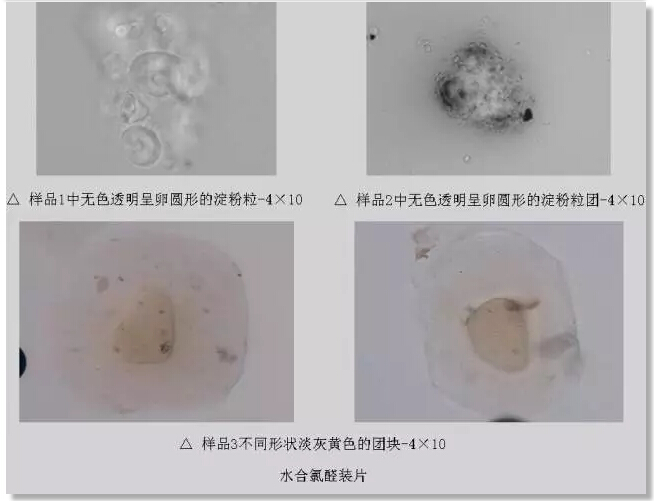 与在样品4中发现的动物组织相比,更令我惊讶的是在样品1、2中发现了淀粉颗粒,不过这无色透明呈卵圆形的淀粉粒看着还蛮晶莹剔透的,只是可惜了都是伪品呐,要知道蟾酥很贵的好不,不要什么淀粉、泥砂、牙膏、肥皂都拿来充次好吗?