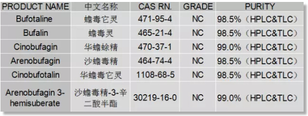 可见,鉴别药材真伪是一件非常麻烦的事,而蟾酥就更麻烦了,那么多掺伪品,不对我已备好小妙招,给你们推荐了系列用于检测蟾酥的对照品,见图吧。