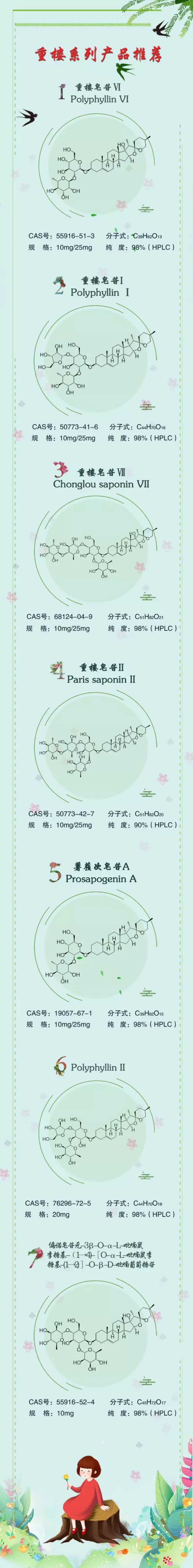 重楼皂苷Ⅵ、重楼皂苷I、重楼皂苷Ⅶ、重楼皂苷II、薯蓣次皂苷A、Polyphyllin II、偏诺皂苷元-3β-O-α-L-吡喃鼠李糖基-(1→ 4 )-[O-α-L-吡喃鼠李糖基-( 1→2) ]-O-β-D-吡喃葡萄糖苷,产品信息如下:
