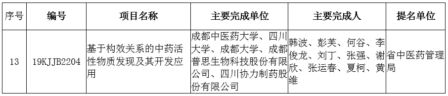 由四川省中医药局提名,我司作为主要完成单位之一申报的“基于构效关系的中药活性物质发现及其开发应用”项目获四川省科学技术进步奖(科技进步类)一等奖,公司董事长兼总经理刘丁先生、原副总经理夏柯先生是项目的主要完成人。项目的主要完成单位还有成都中医药大学、四川大学、成都大学和四川协力制药股份有限公司。