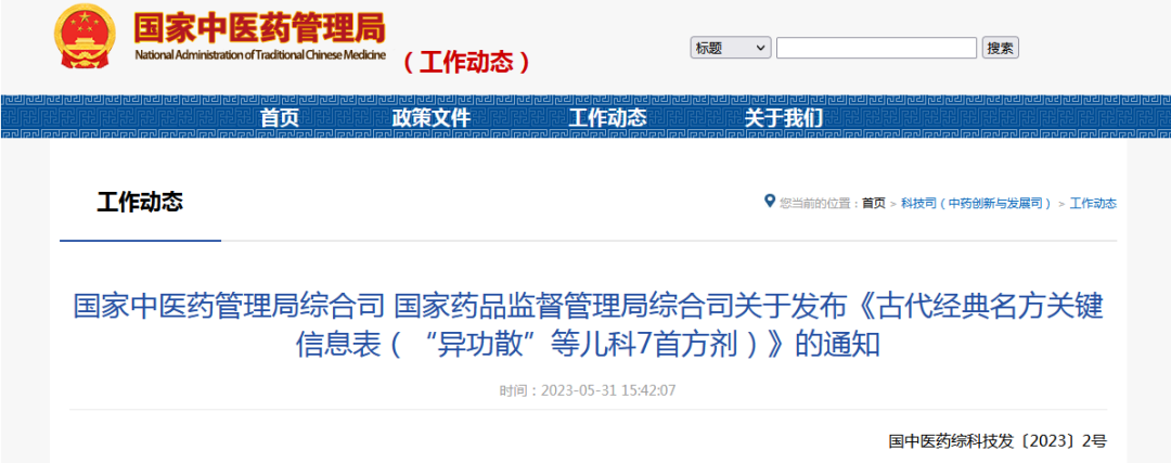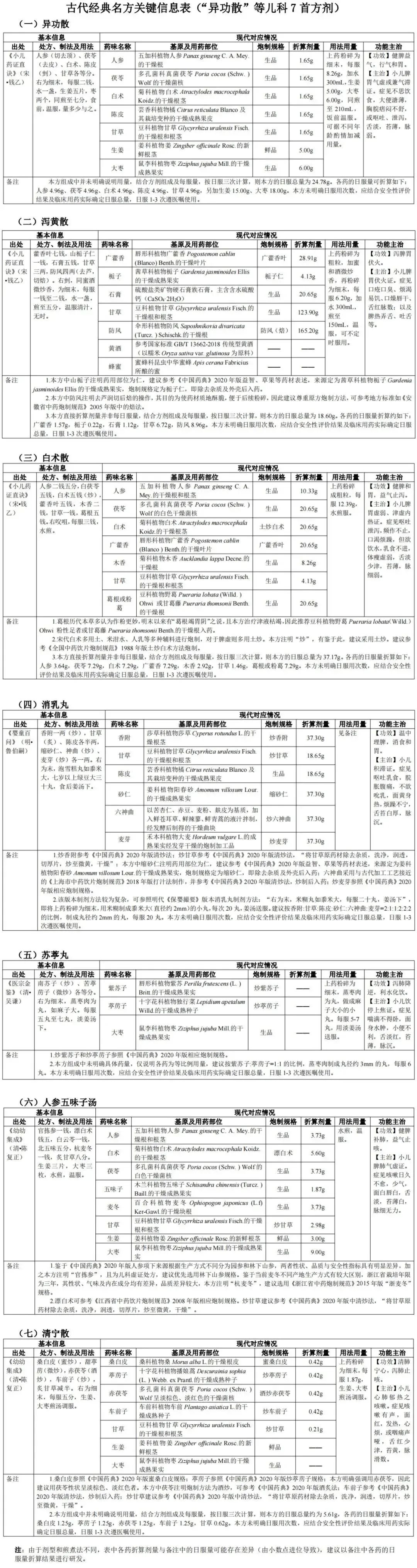 关于发布《古代经典名方关键信息表(“异功散”等儿科7首方剂)》的通知