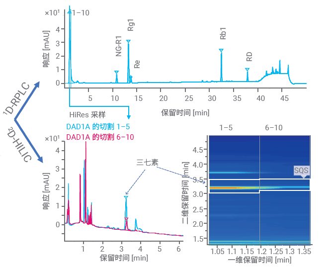 对于复杂样品或化药杂质分析,常需要复杂的液相方法开发和含非挥发性盐流动相,二维色谱相较于传统一维色谱而言,无需繁琐的前处理方法、复杂的色谱条件,还可以使用含盐流动相。二维色谱是传统液相色谱的补充,不仅能提高复杂组分的分离能力,而且能够实现在线脱盐。