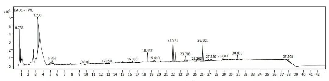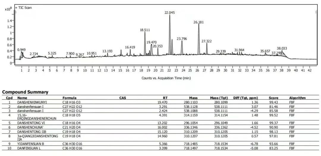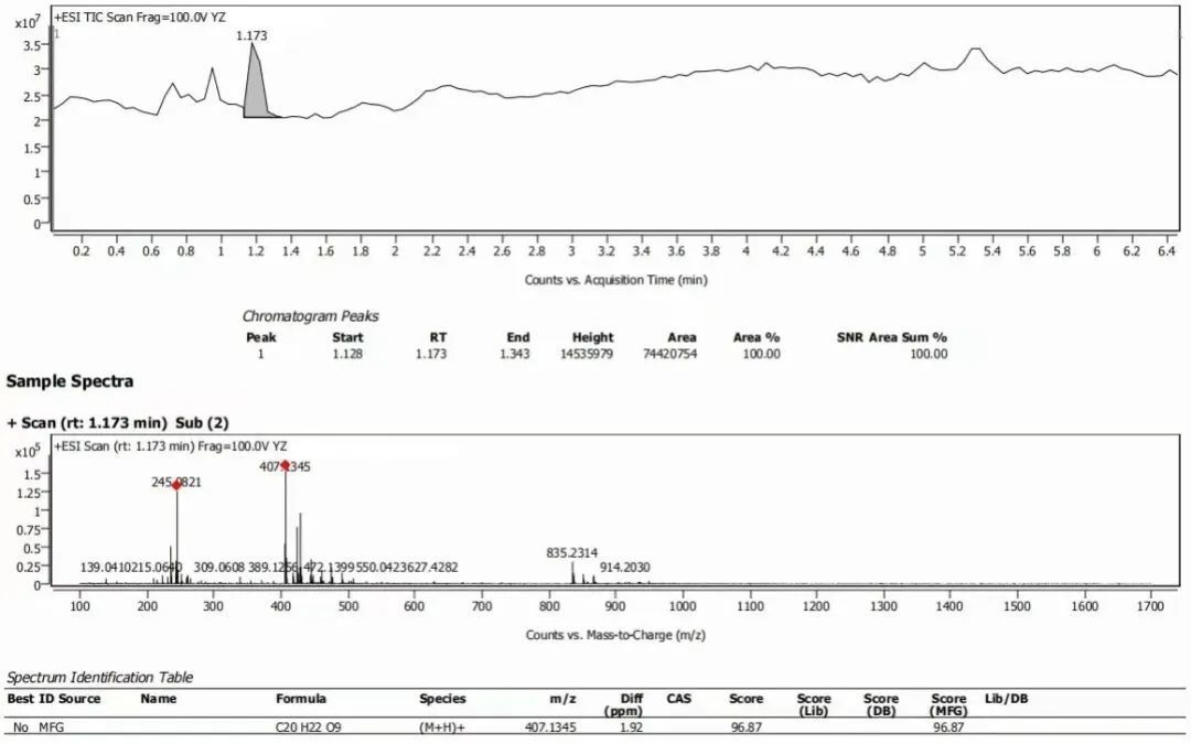 中药材、浸膏/粉、复方制剂、发酵液等复杂样品的化学成分分析。依托UPLC的高效分离能力和Q-TOF的快速鉴定能力,对各个特征峰进行分析。通过多维信息分析给予推测分子式,再通过谱库鉴定给予推测结构式。