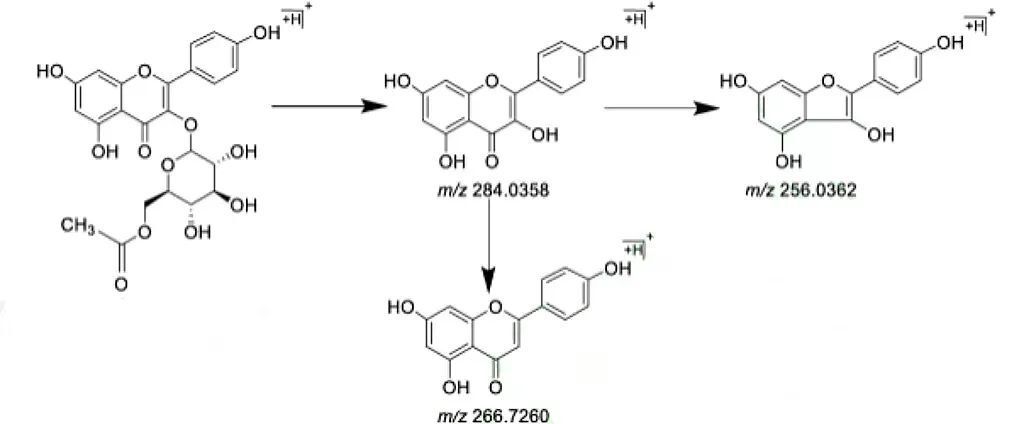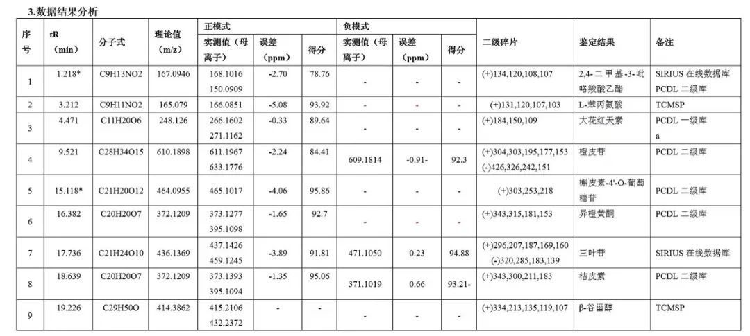 通过精确质量、同位素丰度比、同位素精确质量比及MS/MS四维信息关联分析给予推测分子量、分子式,部分化合物可通过谱库鉴定给予结构式。