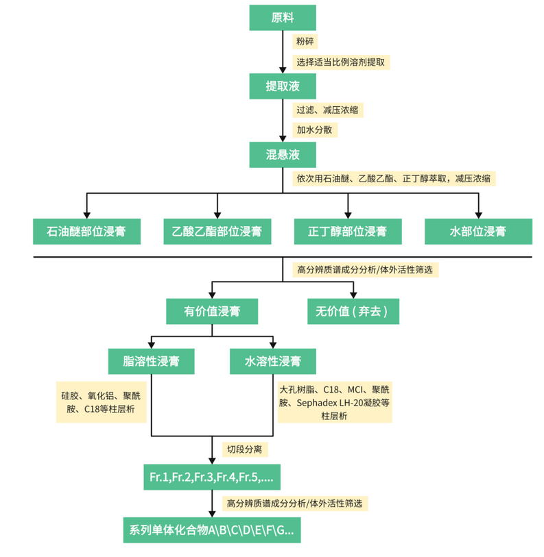 我们综合提取、分离、色谱和质谱分析等方法,对药材/植物内特征成分进行系统化研究,利用高分辨质谱分析UPLC-Q-TOF及实体数据库开展原料检测,锁定目标成分,同时依托普思生物高效的分离纯化平台,能够快速从原料中分离出稀有的、系列天然化合物。