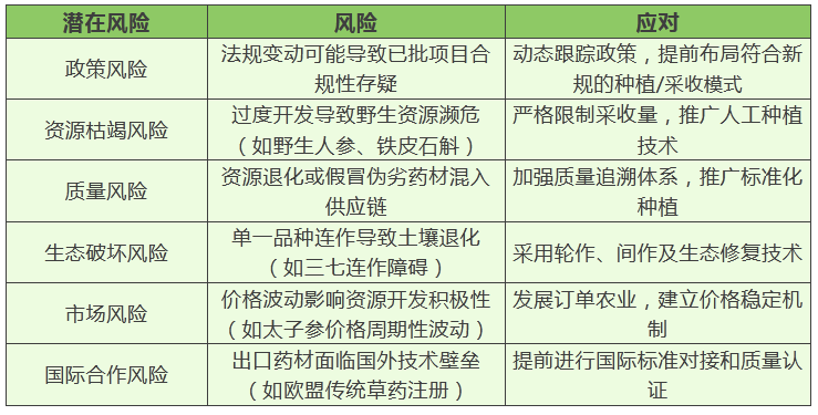 中药资源潜在风险可从中药材再生能力、中药材成药周期、分布区域、濒危等级、特殊价值等方面分析,相关内容可来源于背景资料3、4。