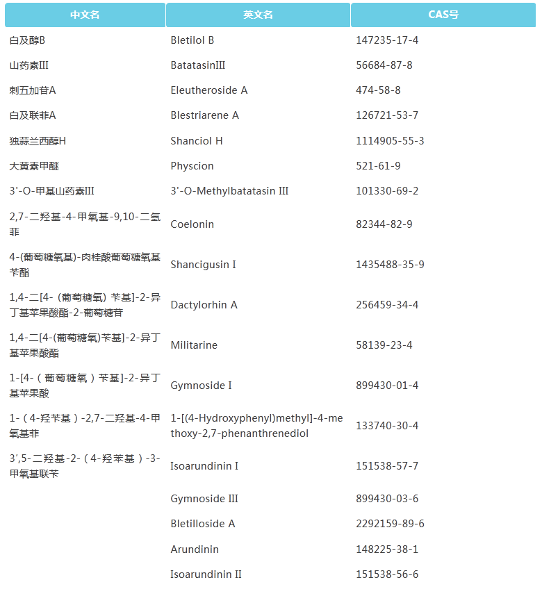 目前我司共有多种白及中联苄类、二氢菲类、菲类、联菲类等活性成分,针对以下重点推荐的产品,普思生物均现货供应,当天发货(价格面议)。