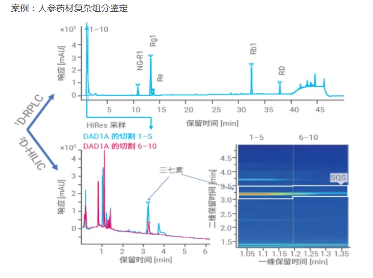 “二维液相”是实现经第一维分离后所检测到的每个峰被中心切割并转移到具有不同选择性的第二维进行进一步分离,再进入“高分辨质谱”进行鉴定检测。