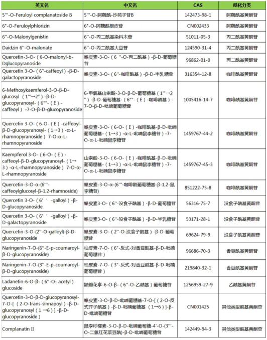 近年来,大量研究发现酰基化黄酮糖苷类化合物在许多植物药中广泛分布。相较于黄酮苷,酰基化结构稳定性与脂溶性更好,生物利用率高,疗效更显著;酰基修饰也正逐步成为药物研发领域的热点之一。酰基化黄酮苷主要具有以下生物活性: