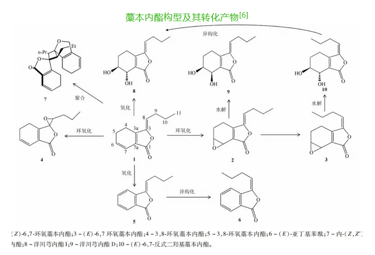 藁本内酯结构中有环外双键可分为顺反两种异构体即(Z)-Ligustilide和(E)-Ligustilide。由于Z型结构为空间优势构象比E型更稳定,因而Z型藁本内酯在中药材中含量为E型的10倍以上[1]。藁本内酯是不饱和苯酞结构且3位上有活泼的丁烯基,因而稳定性不佳极易发生异构化、氧化、环加成、聚合等结构变化产生其他结构相近的苯酞类化合物。