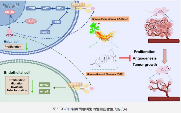 研究者通过酶转化将人参皂苷Ro转化为人参葡萄糖基齐墩果酸(GGO),通过抑制PI3K/AKT/HIF-1α信号通路,减少HIF-1α的核转位和VEGF的表达,从而抑制宫颈癌细胞的增殖和血管生成。[10]