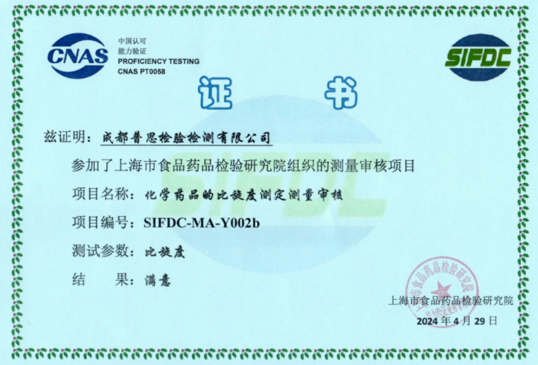 近日,成都普思生物科技股份有限公司旗下子公司“成都普思检验检测有限公司”通过了由上海市食品药品检验研究院于2024年组织的测量审核项目“化学药品的比旋度测定”,结果为“满意”。