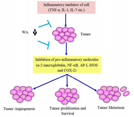醉茄素A具有显著的多效性抗癌活性,实验证实其在乳腺癌、结肠癌、卵巢癌、神经胶质瘤等模型中可抑制肿瘤生长和转移(图1),且对正常细胞毒性较低。通过多靶点机制抑制肿瘤(图2、图3):