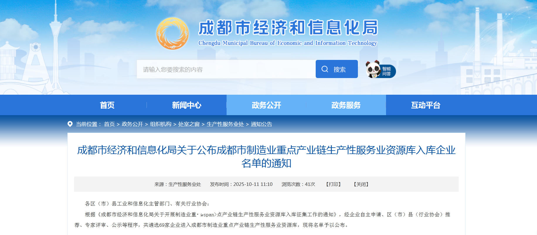 今日,成都市经济和信息化局公布“成都市制造业重点产业链生产性服务业资源库拟入库名单”。